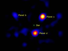 The three known planets of the star HR8799, as imaged by the تلسكوب هيل. The light from the central star was blanked out by a vector vortex coronagraph.