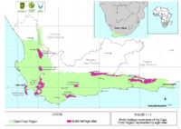 The vegetation of the region is also extremely diverse, with one of the world's six floral kingdoms almost exclusively endemic to the province, namely the Cape Floral Kingdom, most of which is covered by Fynbos (from the Afrikaans meaning "Fine Bush" (Dutch: Fijnbos), though precisely how it came to be referred to as such, is uncertain.).[13][14] These evergreen heathlands are extremely rich in species diversity,[13][14] with at least as many plant species occurring on Table Mountain as in the entire United Kingdom.[14] It is characterised by various types of shrubs, thousands of herbaceous flowering plant species and some grasses.[13] With the exception of the Silver tree, Leucadendron argenteum, which only grows on the granite and clay soils of the Cape Peninsula,[15] open fynbos is generally treeless except in the wetter mountain ravines where patches of Afromontane forest persist.[13][14]