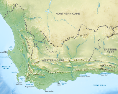The province is topographically exceptionally diverse. Most of the province falls within the Cape Fold Belt, a set of nearly parallel ranges of sandstone folded mountains of Cambrian-Ordovician age (the age of the rocks is from 510 to about 330 million years ago; their folding into mountains occurred about 350 to about 270 million years ago).[7][8][9] The height of the mountain peaks in the different ranges varies from 1،000 متر (3،300 ft) to 2،300 متر (7،500 ft). The valleys between ranges are generally very fertile, as they contain the weathered loamy soils of the Bokkeveld mudstones (see the diagrams below).[8]
