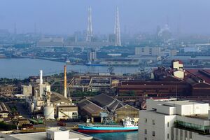 Extensive damage to industrial infrastructure during the war left the region in ruins, with residents suffering from malnutrition. Kitakyushu's industrial revival would come with the outbreak of the Korean War in 1950, when military demand for steel put production at the Yahata Steel Works into overdrive.[14] In the following years, Kitakyushu's development continued to be driven by heavy industry, such as steel and metalworking, and these industries helped drive Japan's post-war economic boom.[10] Like in other major Japanese cities, industrial development in Kitakyushu resulted in severe air and water pollution in the post-war period.[15] In the 1960s, the Dōkai Bay was known as the "Sea of Death" due to severe water pollution caused by industrial runoff, which meant that no living organisms were present in its waters.[16] Eventually this issue was overcome after activism by civic groups, such as the Tobata Women's Association, which resulted in public-private co-operation to curb pollution.[15]