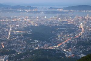 Because of its proximity to the Kanmon Straits, and by extension, the Japanese main island of Honshu, Kitakyushu has long served as the gateway to Kyushu, and as a transport hub.[5] Kitakyushu is the starting point for Kyushu's railway and road network. In the Edo period, Kitakyushu was the northern terminus of the Nagasaki Kaidō, a highway linking Nagasaki, the only port in Japan open to foreign trade under the policy of sakoku, with Honshu.[6] During the Meiji period, railways were constructed from the 1880s, along with the ports of Moji and Wakamatsu.[5] Yahata, located on the Dōkai Bay, was originally nothing more than a fishing village.[7] Its proximity to coal deposits in the surrounding Chikuhō region, and good sea links to sources of iron ore in China, led to it being chosen as the site for the Yahata Steel Works, which opened in 1901. This was the hub of Japan's nascent steel industry, and the surrounding area on the coast of the Dōkai Bay and Genkai Sea emerged as the focal point of Japan's pre-Second World War industrialisation.[8] By 1913, Yahata was responsible for 85% of Japan's total steel output; the city's population grew from 6,652 in 1901 to 100,235 in 1920.[9] In recognition of the area's contributions to Japan's industrial history, several historical sites in the city, including the head office of the steel works, were recognised by UNESCO in 2015 as part of the "Sites of Japan's Meiji Industrial Revolution: Iron and Steel, Shipbuilding and Coal Mining".