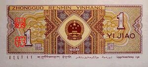 The reverse of a one jiao note with Chinese (Pinyin) at the top and Mongolian, Tibetan, Uyghur, and Zhuang along the bottom.