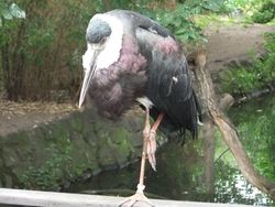 • اللقلق صوفي العنق كبير الحجم فيصل طوله أحيانا إلى 85 سم ويشه عبارة عن خليط بين الأسود والقرمزي الباهت في كل من الأجنحة والصدر والبطن بينما الذيل والعنق أبيض اللون وجلد ما بين العينين رمادي اللون وله منقار أصفر باهت عليه بقعة زهرية في نهاية المنقار.