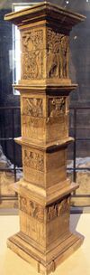 The Pillar of the Boatmen was donated to the city in about 14-17 AD (dedicated to the Emperor Tiberius) by the guild of boatmen, the most influential guild in the city, and was found in the Île-de-la-Cité. It depicted both Roman and Gallic deities in a series of blocks stacked into a column.[35]