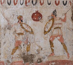 Duel of Lucanian warriors, fresco from a tomb of the 4th century BC.