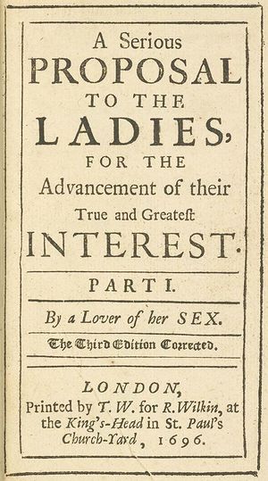 • A Serious Proposal to the Ladies for the Advancement of their True and Greatest Interest. By a Lover of Her Sex. 1694, 1695, 1696 1697 (two printings), 1701, 1703