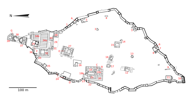 28–39. القصر الشمالي: 28. المقام الكبير. 29. quarry. 30. مقرات القيادة. 31. برج. 32. مباني ادارية. 33. بوابة. 34. مخازن. 35. حمامات. 36. بوابة المياه.