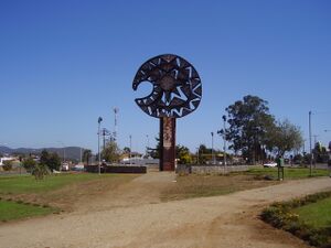Monument in the form of a gigantic clava mere okewa, located in Avenida Presidente Eduardo Frei Montalva, Cañete, Chile
