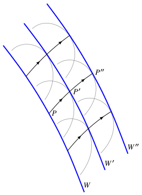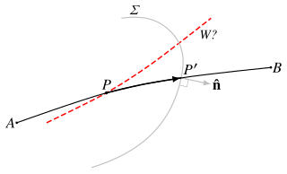 For the purpose of comparing traversal times, the time from one point to the next nominated point is taken as if the first point were a point-source.[3] Without this condition, the traversal time would be ambiguous; for example, if the propagation time from P to P′ were reckoned from an arbitrary wavefront W containing P (Fig. 2), that time could be made arbitrarily small by suitably angling the wavefront.