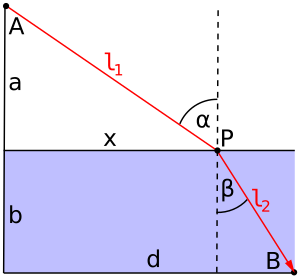 If a ray follows a straight line, it obviously takes the path of least length. هيرون السكندري، في كتابه Catoptrics (1st century CE), showed that the ordinary law of reflection off a plane surface follows from the premise that the total length of the ray path is a minimum.[12] In 1657, Pierre de Fermat received from Marin Cureau de la Chambre a copy of newly published treatise, in which La Chambre noted Hero's principle and complained that it did not work for refraction.[13]