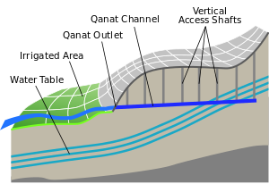In Oman from the Iron Age, in Salut, Bat, and other sites, a system of underground aqueducts called falaj or qanāts were constructed, a series of well-like vertical shafts, connected by gently sloping horizontal tunnels.