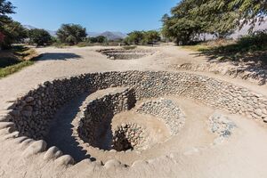 Near the Peruvian town of Nazca, an ancient pre-Columbian system of aqueducts called Puquios were built and are still in use today. They were made of intricately placed stones, a construction material widely used by the Nazca culture. The time period in which they were constructed is still debated, but some evidence supports circa A.D. 540–552, in response to drought periods in the region.[4]