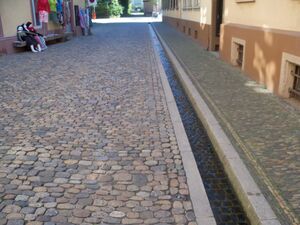 Rills are also used for aesthetic purposes in landscape design. Rills are used as narrow channels of water inset into the pavement of a garden, as linear water features, and often tiled and part of a fountain design.