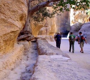 Throughout Petra, Jordan, the Nabataean engineers took advantage of every natural spring and every winter downpour to channel water where it was needed. They constructed aqueducts and piping systems that allowed water to flow across mountains, through gorges and into the temples, homes, and gardens of Petra's citizens. Walking through the Siq, one can easily spot the remains of channels that directed water to the city center, as well as durable retention dams that kept powerful flood waters at bay.