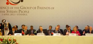البلدان السبعون التي شاركت في المؤتمر الذي عقد في 1 أبريل 2012 لدعم المعارضة السورية ولزيادة الضغط على الحكومة السورية. يزعم المجلس الوطني السوري أن المعارضة المتحدة حالياً تطالب "بتحرك جاد" ويقول أنهم سوف "يتحملون مسئولية دفع مرتبات ثابتة "للجيش السوري الحر". دافع رئيس الوزراء التركي بقوله أن السوريون يطالبون بحق الدفاع عن النفس، وطالب المجمتع الدولي بالإلتفات للشعب السوري. وأضاف "نعتقد أيضاً أن المجتمع الدولي لديهم التزام أخلاقي بالتحرك. سفك الدماء في سوريا يجب أن يتوقف،". حمد بن جاسم بن جابر آل ثاني، رئيس الوزراء القطري، الأمين العام لجامعة الدول العربية ووزيرة الخارجية الأمريكية هيلاري كلينتون دعموا الأخذ بتدابير أكثر قوة تجاه الحكومة السورية.[5]