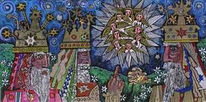 تصوير تقليدي بعد القرن الثاني عشر لـمجوس الإنجيل (Adoração dos Magos بريشة ڤيسنتى گيل). بلتزار، أصغر المجوس، يحمل البخور ويمثل أفريقيا. إلى اليسار يقف كاسپر، في منتصف العمر، ويحمل الذهب ممثلاً لآسيا. جاثياً على ركبتيه ملكيور، أكبرهم، حاملاً المر ويمثل أوروپا.