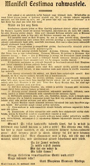 After the successful October Revolution in Petrograd, the Estonian Military Revolutionary Committee, led by Viktor Kingissepp, took power from the provisional government's commissar.[49] The Bolsheviks were, however, unable to consolidate their power owing to the lack of Bolshevik officials who could replace the former government's public officials; the latter refused and launched the strike.[52] The Estonian Bolsheviks had lost much of their popular support by the end of January 1918, engaging in the cancellation of the Estonian Constituent Assembly election held on قالب:OldStyleDateNY.[53] With the German advance in southern Livonia and Estonia and the Bolsheviks fleeing to Soviet Russia, the Estonian Provincial Assembly asserted Estonia "independent and democratic republic" within its "historical and ethnographical borders" on 24 February, with Konstantin Päts being the leader of the new provisional government.[54][55][56] This was nonetheless a symbolic indication, and the Germans, on the following day, entered Reval.