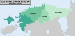 The Governorate of Estonia,[أ] also known as the Esthonia (Estland) Governorate,[1][2][3][4] was a province (guberniya) and one of the Baltic governorates of the Russian Empire. It was located in the northern Estonia with some islands in the West Estonian archipelago, including Hiiumaa and Vormsi. Previously, the Reval Governorate existed during Peter I's reign and was confirmed by the Treaty of Nystad, which ceded territory from Sweden to the newly established Russian Empire. The Estonia Governorate was established in 1796 when Paul I's reforms abolished the Reval Viceroyalty. The port city of Reval (known in Russian as Revel, contemporary Tallinn) was the administrative centre where the governor had his seat.