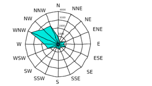وردة الرياح لمنطقة أورفة، تُظهر الاتجاهات الرئيسية التي تهب منها الرياح.[2]:195