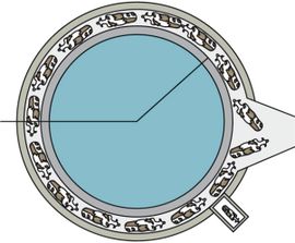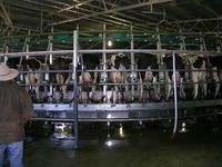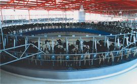 2ـ المحالب الدوارة: يتكون المحلب الدوار من منصة دائرية دوارة تقف عليها الأبقار على نحو متتابع أو منحرف أو متجانب لتحلب جميعها بدورة واحدة في (4ـ9) دقائق بحيث لا تتجاوز سرعة دوران المنصة 0.2م/ثا (الشكل 11 ـ أ وب).