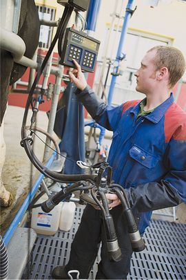 - لوحة المراقبة الإلكترونية: تزود بها أجهزة حلابة المحالب المؤتمتة (الشكل 6) وتكون موصولة مع الحاسب المركزي الذي يقدم جميع المعلومات المتعلقة بعملية الحلابة: رقم البقرة المُعدّة للحلابة، حالتها الصحية، طبيعتها، إدرارها وكمية الحليب التي حُلبت في أثناء الوردية الواحدة.