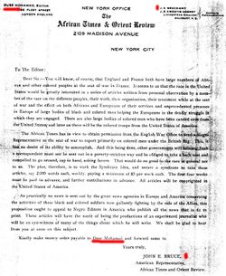 رسالة من جون بروس إلى الصحفيين من الأقليات يخبرهم بعزم الصحيفة على إرسال مراسلين لتغطية الحرب العالمية من وجهة نظر الملونين والتكلفة بالنسبة لصحفهم. يظهر اسم دوسي كممثل للصحيفة في نيويورك مع اسمه كمححرر (الخطوط الحمراء). من المجموعة الخاصة للبروفسيور أديليد كرومويل گولڤر المديرة السابقة لمركز الدراسات الأفروأمريكية بجامعة بوسطن.