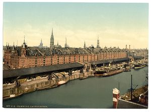 Der Sandtorhafen (erste Schuppenreihe Sandtorquai ) mit der Speicherstadt um 1898 am linken Bildrand abgeschnitten die Kehrwiederspitze, Türme (v.l.n.r.): neues Rathaus), St. Nikolai, St. Petri, St. Katharinen und St. Jakobi |