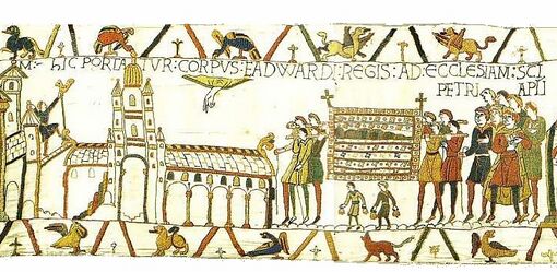Between 1042 and 1052, King Edward the Confessor began rebuilding St Peter's Abbey to provide himself with a royal burial church. It was the first church in England built in the Romanesque style. The building was completed around 1060 and was consecrated on 28 December 1065, only a week before Edward's death on 5 January 1066.[7] A week later, he was buried in the church; and, nine years later, his wife Edith was buried alongside him.[8] His successor, Harold II, was probably crowned in the abbey, although the first documented coronation is that of William the Conqueror later the same year.[9]