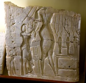 In year five of her father Akhenaten's reign, Meritaten appears on the boundary stelae designating the boundaries of the new capital to which her father moved the royal family and his administrators.[2][5] During Akhenaten's reign, she was the most frequently depicted and mentioned of the six daughters. Her figure appears on paintings in temples, tombs, and private chapels. Not only is she shown among images showing the family life of the pharaoh, which were typical of the Amarna Period, but on those depicting official ceremonies, as well.[2]