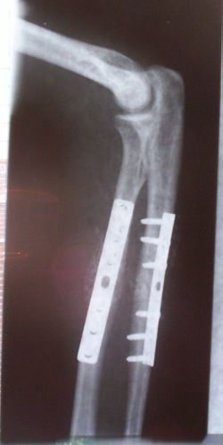 غرسات العظام لإصلاح الكسور في الكعبرة والزند. لاحظ الكسر المرئي في عظم الزند. (الساعد الأيمن)