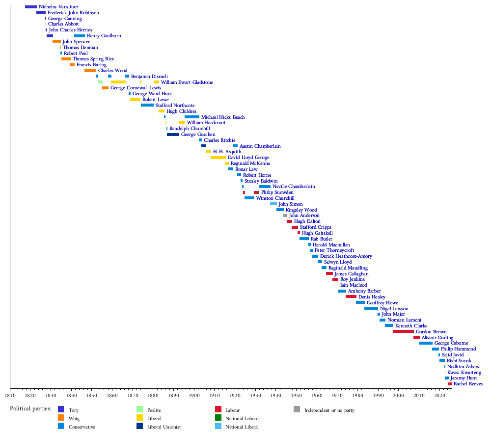 Rachel ReevesJeremy HuntKwasi KwartengNadhim ZahawiRishi SunakSajid JavidPhilip HammondGeorge OsborneAlistair DarlingGordon BrownKenneth ClarkeNorman LamontJohn MajorNigel LawsonGeoffrey HoweDenis HealeyAnthony BarberIain MacleodRoy JenkinsJames CallaghanReginald MaudlingSelwyn LloydDerick Heathcoat-AmoryPeter ThorneycroftHarold MacmillanRab ButlerHugh GaitskellStafford CrippsHugh DaltonJohn Anderson, 1st Viscount WaverleyKingsley WoodJohn Simon, 1st Viscount SimonWinston ChurchillPhilip SnowdenNeville ChamberlainStanley BaldwinRobert Horne, 1st Viscount Horne of SlamannanBonar LawReginald McKennaDavid Lloyd GeorgeH. H. AsquithAustin ChamberlainCharles Ritchie, 1st Baron Ritchie of DundeeGeorge Goschen, 1st Viscount GoschenLord Randolph ChurchillWilliam Hardcourt (politician)Michael Hicks Beach, 1st Earl St AldwynHugh ChildersStafford NorthcoteRobert LoweGeorge Ward HuntGeorge Cornewall LewisWilliam Ewart GladstoneBenjamin DisraeliCharles Wood, 1st Viscount HalifaxFrancis Baring, 1st Baron NorthbrookThomas Spring Rice, 1st Baron Monteagle of BrandonRobert PeelThomas Denman, 1st Baron DenmanJohn Spencer, 3rd Earl SpencerHenry GoulburnJohn Charles HerriesCharles Abbott, 1st Baron TenterdenGeorge CanningFrederick John RobinsonNicholas Vansittart