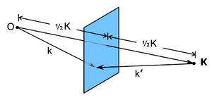 By comparing this equation with the definition of a reciprocal lattice vector, we see that constructive interference occurs if is a vector of the reciprocal lattice. We notice that and have the same magnitude, we can restate the Von Laue formulation as requiring that the tip of incident wave vector, , must lie in the plane that is a perpendicular bisector of the reciprocal lattice vector, . This reciprocal space plane is the Bragg plane.