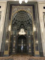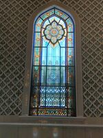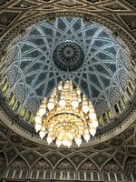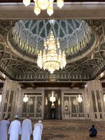 يوجد في المصلى قبة مركزية بارتفاع 50 متراً مزينة بالفسيفساء تتدلى منها ثريا تعد الأضخم بعد ثريا جامع الشيخ زايد في أبوظبي، إنّ الثريا فوق قاعةِ الصَلاة يبلغ طولها 14 مترُ. هي أيضاً ثاني أكبرَ ثريا في العالمِ بعد الثريا الأولى في مسجد الشيخ زايد في أبو ظبي، الذي فَتحَ أبوابَه في عام 2007، إذ ترتفع 14 متراُ، وبقطر 8 أمتار وتزن 8 أطنان ويوجد بها 1122 شمعة. والقبة من الداخل محاطة بتصميمات مجسمة لها شكل مثلثات هندسية ضمن هيكل من الأضلاع والأعمدة الرخامية المتقاطعة بأقواس مدببة مرصعة بجميع عناصرها بألواح من الخزف المصقول، وتأخذ الأضلاع الرخامية المقوسة والمعقودة هيكل القبة الكروي المزينة بالزجاج الملون.