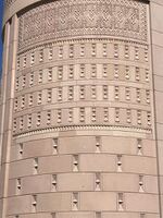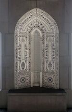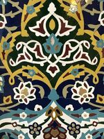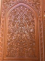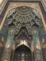 ويلف القبة شريط من الزخارف الكتابية يتضمن آيات قرآنية بخط الثلث بألوان جذابة. كما أن للقبة غشاء مخرماً متشابكاً منمقة خطوطه بشعرية ذهبية، وتتجلى من خلال شفافية هيكل القبة الثانية المكسوة بقشرة من أحجار الفسيفساء الذهبية بأكملها.
