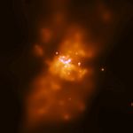This is a composite image made from three satellite observation projects. Visible aspects of the galaxy were taken by the HST. It is also shown in invisible infrared and X-ray spectrums: Spitzer photographed it in infrared, which shows dust emission, and Chandra photographed it in X-ray (showing mostly synchrotron emissions from fast electrons). The X-ray emission is shown in the blue parts.