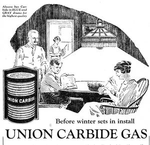 في 1892، اكتشف توماس ويلسون عملية كفوءة اقتصادياً لانتج كربيد الكالسيوم في فرن قوس كهربائي من خليط الجير وفحم الكوك. الفرن القوسي ينتج درجة الحرارة العالية المطلوبة لإتمام التفاعل.[4] صناعة كربيد الكالسيوم كانت جزءاً هاماً من الثورة الصناعية في الكيمياء، وأصبحت ممكنة في الولايات المتحدة نتيجة الكميات الهائلة من الطاقة الهيدرومائية الرخيصة في شلالات نياگرا قبل بداية القرن العشرين.[5] وفي 1895، باع ويلسون براءة الاختراع إلى يونيون كاربايد. الاضاءة المنزلية بغاز الأستيلين بدأت حوالي سنة 1894 ومصابيح الدراجات منذ 1896. وفي فرنسا، تمكن أيضاً گوستاڤ تروڤيه، مهندس الكهرباء الپاريسي، من انتاج مصابيح الأستيلين المنزلية وgasometers.