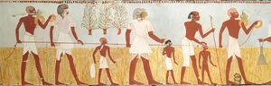 كانت الزراعة في مصر تعتمد على دورة نهر النيل. وكان المصريون يعرفون ثلاثة فصول: آخت (الفيضان)، پرت (الزراعة)، وشمو (الحصاد). كان موسم الفيضان يستمر من يونيو إلى سبتمبر، حيث تترسب على ضفاف النهر طبقة من الطمي الغني بالمعادن المثالية لزراعة المحاصيل. وبعد انحسار مياه الفيضان، استمر يموسم الزراعة من أكتوبر إلى فبراير. كان المزارعون يحرثون الحقول ويزرعون البذور فيها، التي كانت تُروى عن طريق الخنادق والقنوات. كانت مصر تتلقى القليل من الأمطار، لذا اعتمد المزارعون على نهر النيل لري محاصيلهم.[88] من مارس إلى مايو، كان المزارعون يستخدمون المنجال لحصاد محاصيلهم، والتي كانت تُدرس بعد ذلك باستخدام المخباط لفصل القش عن الحبوب. كانت الغربلة تزيل الحثالة من الحبوب، ثم تُطحن الحبوب إلى دقيق، وتُخمر لصنع البيرة، أو تُخزن للاستخدام لاحقاً.[89]