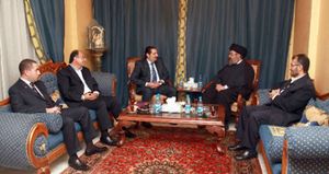 حسن نصر الله وسعد الحريري وحسين الخليل ونادر الحريري ومصطفى ناصر، في لقاء يوم الأحد 18 يوليو 2010. المصدر: جريدة السفير اللبنانية