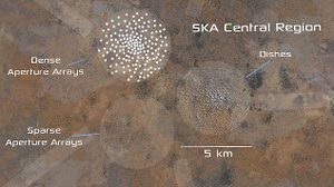 - منطقة مركزية تحتوي على مساحة تشمل أطباق مساحتها 5 كيلومترات من الهوائيات ، ومحطات SKA متوسطة والهوائيات SKA المنخفضة. وهذه المنطقة الوسطى تحتوي على ما يقرب من نصف المساحة الإجمالية لجميع مصفوفات SKA الثلاثة.