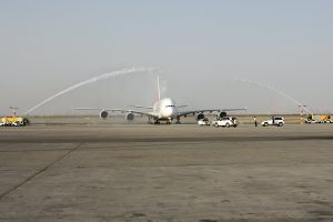 The Emirates Airbus A380 saluted by traditional water cannon ceremony In Imam Khomeini Int'l Airport, 2014