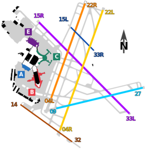 Depending on the prevailing winds, different runways are used for takeoffs and landings:
