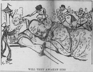 During this period, the phrase "yellow peril" was popularized in the U.S. by newspapers owned by William Randolph Hearst.[20] It was also the title of a popular book by an influential U.S. religious figure, G. G. Rupert, who published The Yellow Peril; or, Orient vs. Occident in 1911. Based on the phrase "the kings from the East" in the Christian scriptural verse Revelation 16:12,[21] Rupert made the claim that China, India, Japan and Korea were attacking the West, but that Jesus Christ would stop them.[22] In his 1982 book The Yellow Peril: Chinese Americans in American fiction, 1850–1940, William F. Wu states that "Pulp magazines in the 30s had a lot of yellow peril characters loosely based on Fu Manchu... Most were of Chinese descent, but because of the geopolitics at the time, a growing number of people were seeing Japan as a threat, too."[23]