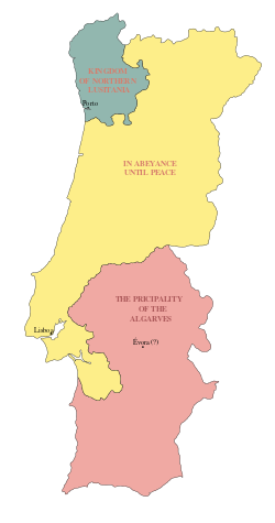 The Kingdom of Northern Lusitania would pass to the country's king's descendants according to Spanish inheritance law as would the Principality of the Algarves. In the absence of legitimate heirs of either territory they would revert to the Spanish throne, without ever becoming united under one sovereign. Both entities would remain under the aegis of the Spanish king, and would be unable to make war or agree peace without his consent.