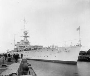 إتش‌إم‌إس Hawkins, lead ship for her class of heavy cruisers alongside a quay, probably during the interwar period