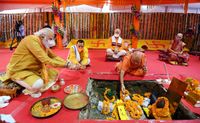 Narendra Modi performing Bhoomi Pujan at the groundbreaking. Also visible are Mohan Bhagwat and Anandiben Patel.