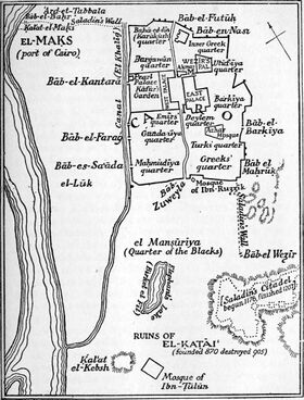 A plan of Fatimid Cairo as reconstructed by Stanley Lane-Poole, showing the approximate layout of the city and the location of the palaces