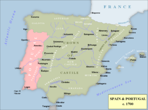 Campaigning in Spain and size of the armies involved were limited by logistics to a greater extent than Flanders or Italy. Reliance on local sources for forage and other supplies limited operations in arid areas like Northern Spain, while until the advent of railways in the 19th century, goods and supplies were largely transported by water.[6] Control of the seas allowed the Allies to successfully conduct short-term offensives outside the coastal areas but lack of popular support meant they could not hold territory. The Grand Alliance secured an operations base in Lisbon when Peter II of Portugal changed sides in May 1703, and the following March, Archduke Charles of Austria arrived to head a land campaign.[7]