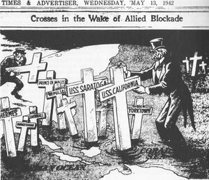To give advance warning of the approach of any Allied naval forces, the Japanese sent submarines I-22, I-24, I-28 and I-29 to form a scouting line in the ocean about 450 nmi (520 mi; 830 km) southwest of Guadalcanal. Fletcher's forces had entered the Coral Sea area before the submarines took station, and the Japanese were therefore unaware of their presence. Another submarine, I-21, which was sent to scout around Nouméa, was attacked by Yorktown aircraft on 2 May. The submarine took no damage and apparently did not realize that it had been attacked by carrier aircraft. Ro-33 and Ro-34 were also deployed in an attempt to blockade Port Moresby, arriving off the town on 5 May. Neither submarine engaged any ships during the battle.[27]