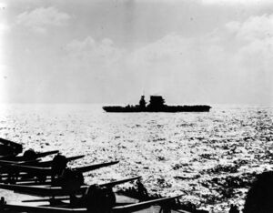 The Carrier Strike Force, with the carriers Zuikaku and Shōkaku, two heavy cruisers, and six destroyers, sortied from Truk on 1 May. The strike force was commanded by Vice Admiral Takeo Takagi (flag on cruiser Myōkō), with Rear Admiral Chūichi Hara, on Zuikaku, in tactical command of the carrier air forces. The Carrier Strike Force was to proceed down the eastern side of the Solomon Islands and enter the Coral Sea south of Guadalcanal. Once in the Coral Sea, the carriers were to provide air cover for the invasion forces, eliminate Allied air power at Port Moresby, and intercept and destroy any Allied naval forces which entered the Coral Sea in response.[25]