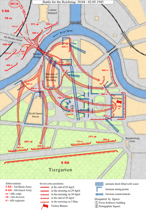 وعندما عبر السوفيت الخطوط الدفاعية وتراجع المدافعون، تركزوا في منطقة صغيرة في وسط المدينة. وكانوا حوالي 10.000 جندي ألماني، تمت مهاجمتهم من جميع الجهات. وعلى جانب آخر دكت المدفعية السوفيتية مبنى وزارة الطيران المبني من الخرسانة المسلحة. وتراجعت كتيبة دبابات التايگر الألمانية من مواقعها شرق تيرگارتن للدفاع عن وسط المدينة ضد جيش الحرس الثالث بقيادة كوتزنيتسوف (الذي على الرغم من اشتراكه في القتال بضراوة حول الرايخستاگ إلا أنه كان يتقدم من شمال تيرگارتن) وضد جيش الحرس الثامن الذي يتقدم من جنوب تيرگارتن[59]. وقامت هذه القوات السوفيتية بقطع المنطقة التي تشبه الهلال التي يمسك بها الألمان إلى نصفين وجعلوا الهروب إلى الغرب أكثر صعوبة[60].